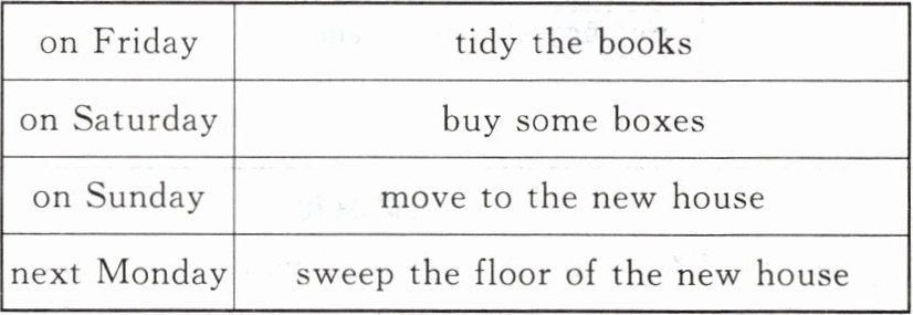 on Friday: tidy the books on Saturday: buy some boxes on Sunday: move to the new house next Monday: sweep the floor of the new house