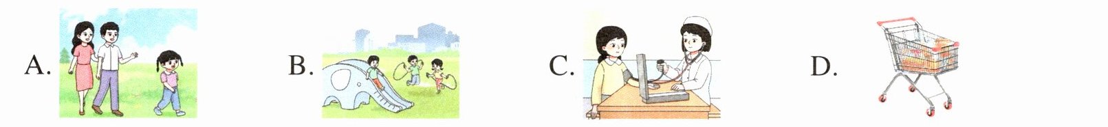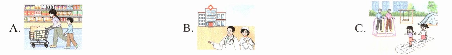 1. D 【点拨】句意为:我们去商店购物吧。故选D。2. A 【点拨】句意为:我们经常在公园里散步。故选A。3. B 【点拨】对话意为:——有一个游乐场。——我们在那里做运动吧。故选B。4. C 【点拨】对话意为:——妈妈,我感觉不太舒服。 ——噢,我们去看医生吧。故选C。