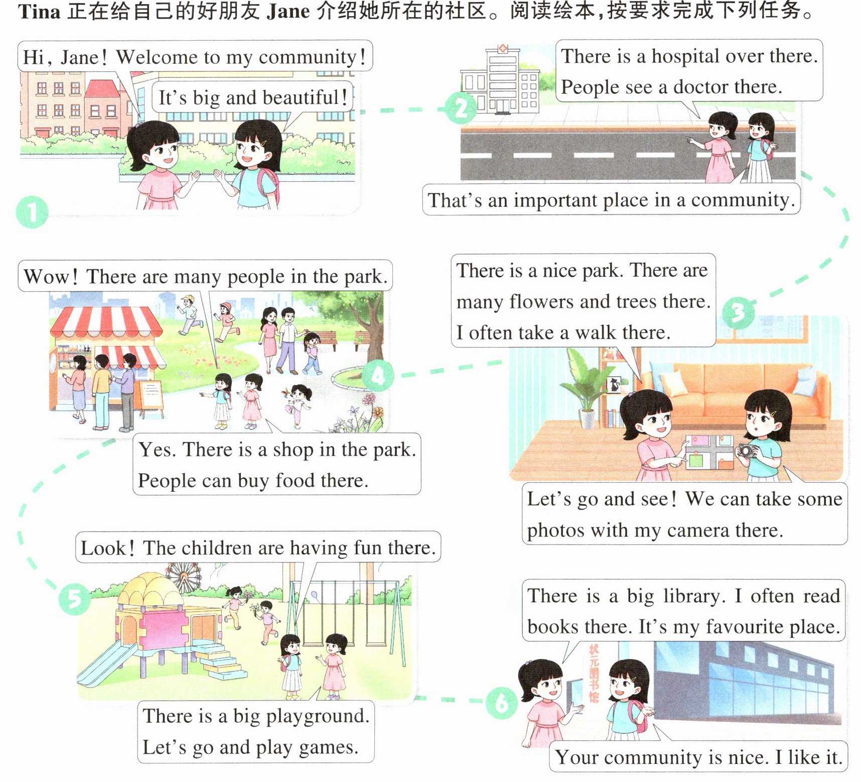 Tina正在给自己的好朋友Jane介绍她所在的社区。阅读绘本,按要求完成下列任务。