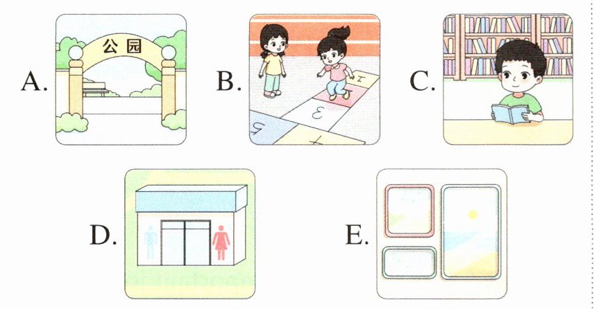 1. E 【点拨】句意为“有一些照片”。E项与句意相符,故选 E。2. A 【点拨】句意为“我最喜欢的地方是公园”。A项与句意相符,故选 A。3. D 【点拨】句意为“社区里有卫生间”。D项与句意相符,故选 D。4. B 【点拨】句意为“我们在操场上玩游戏吧”。B项与句意相符,故选 B。5. C 【点拨】句意为“我可以在图书馆里读故事”。C项与句意相符,故选 C。