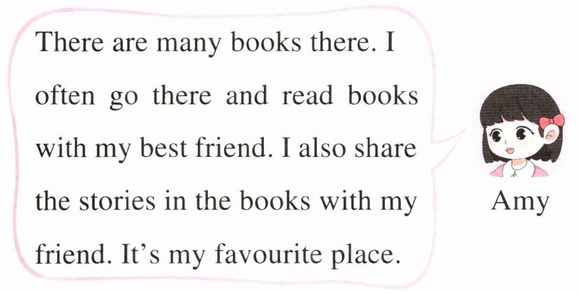 Amy: There are many books there. I often go there and read books with my best friend. I also share the stories in the books with my friend. It's my favourite place.
