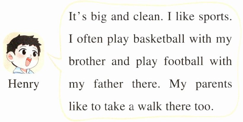 Henry: It's big and clean. I like sports. I often play basketball with my brother and play football with my father there. My parents like to take a walk there too.