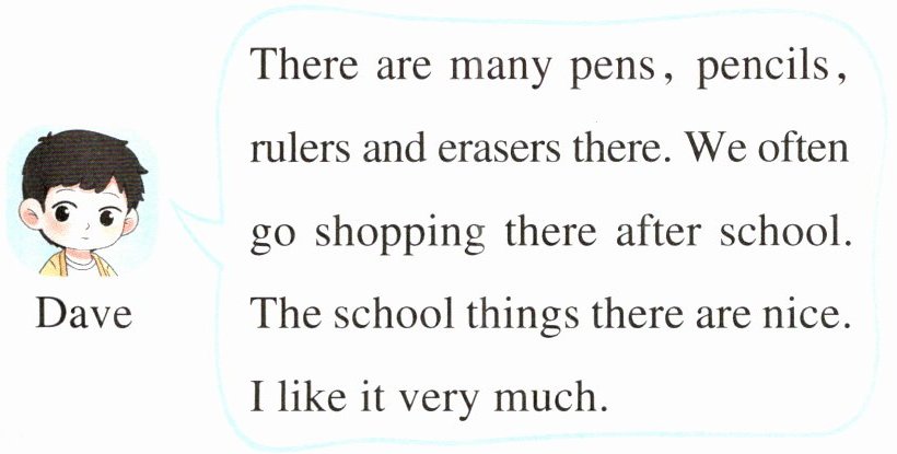 Dave: There are many pens, pencils, rulers and erasers there. We often go shopping there after school. The school things there are nice. I like it very much.