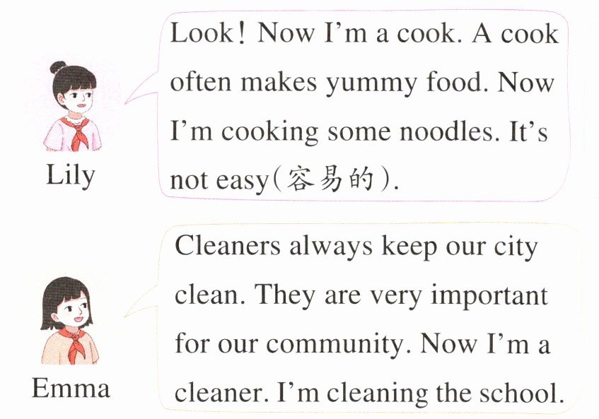 Lily: Look! Now I'm a cook. A cook often makes yummy food. Now I'm cooking some noodles. It's not easy(容易的).