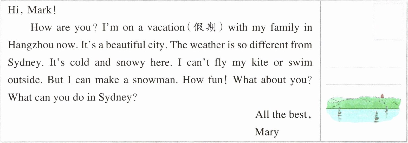 | Hi, Mark! How are you? I'm on a vacation(假期) with my family in Hangzhou now. It's a beautiful city. The weather is so different from Sydney. It's cold and snowy here. I can't fly my kite or swim outside. But I can make a snowman. How fun! What about you? What can you do in Sydney? All the best, Mary | |