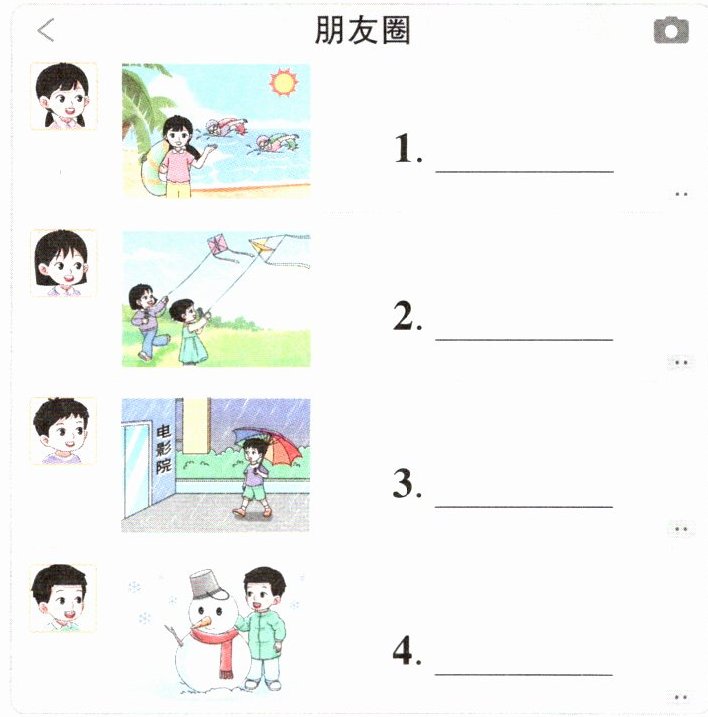 4. B 【点拨】B项意为“我喜欢下雪天。看!我可以堆雪人!”。句子与图片相符,故选B。