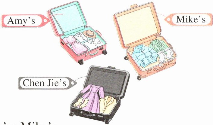 1. F 【点拨】句子意为“绿色外套是迈克的”。观察图片可知迈克行李箱里的外套是蓝色的而不是绿色的。句子与图片不符,故填F。2. T 【点拨】句子意为“黄色短袜是陈杰的”。观察图片可知陈杰行李箱里有黄色短袜。句子与图片相符,故填T。3. F 【点拨】句子意为“埃米将要去寒冷的地方”。观察图片可知埃米行李里有连衣裙、衬衫和遮阳帽等衣物,暗示埃米将要去温暖的地方。句子与图片不符,故填F。4. T 【点拨】对话意为“——这是谁的紫色连衣裙? ——是陈杰的”。观察图片可知陈杰行李箱里有紫色连衣裙。对话与图片相符,故填T。5. F 【点拨】对话意为“——这些是谁的白衬衫? ——是迈克的”。观察图片可知迈克行李箱里没有白衬衫。对话与图片不符,故填F。