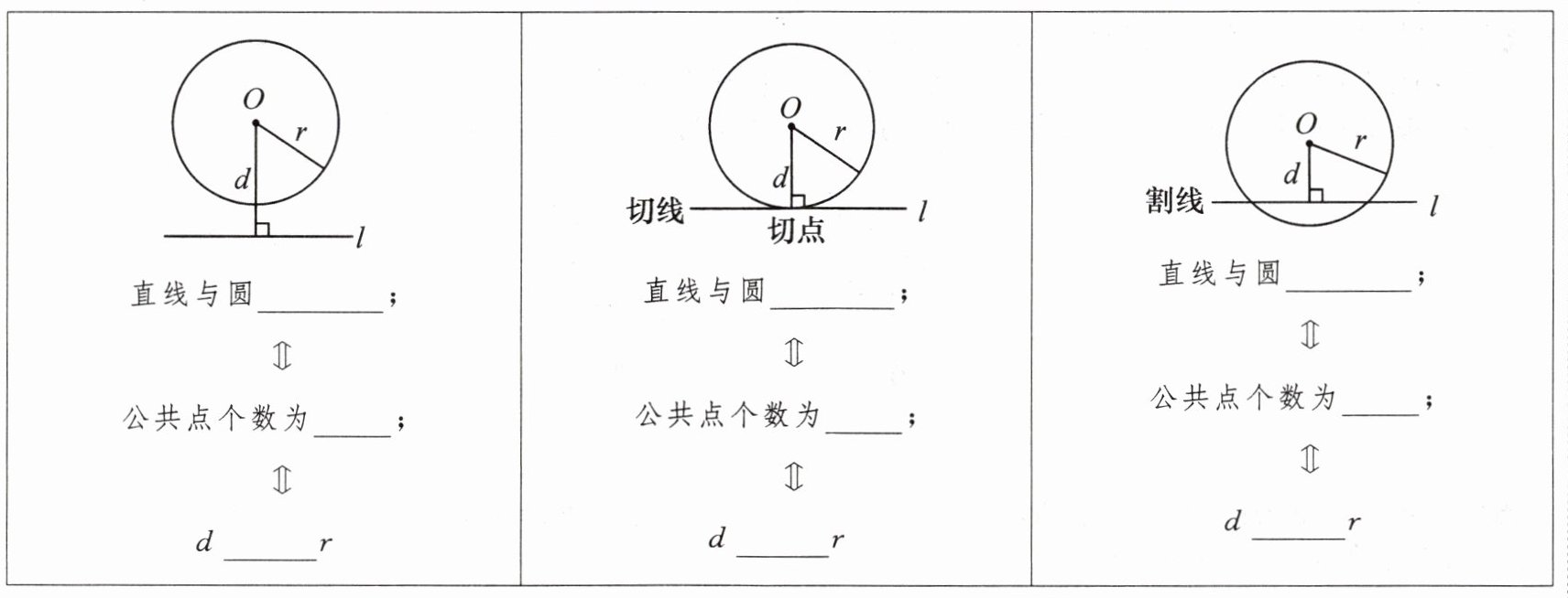 小结:直线 $l$ 与 $\odot O$ 公共点数量 $\Leftrightarrow$ 直线与圆的位置关系 $\Leftrightarrow d$ 与 $r$ 的数量关系。