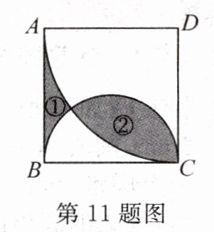 11. 如图,在边长为2的正方形ABCD中,以点D为圆心,AD的长为半径画弧,再以BC为直径画半圆.若阴影部分①的面积为$S_{1}$,阴影部分②的面积为$S_{2}$,则$S_{2} - S_{1}$的值为