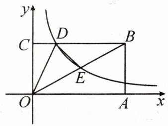 3. (2023·广州增城区二模)如图,在矩形 $ OABC $ 中,$ E $ 是对角线 $ OB $ 的中点,$ OA=4 $,$ OC=2 $. 反比例函数 $ y=\frac{k}{x}(x>0) $ 的图象经过点 $ E $,与边 $ BC $ 相交于点 $ D $.