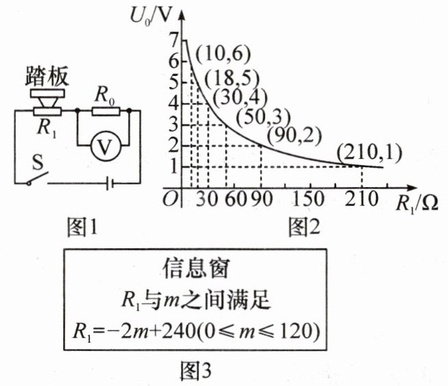 3. 新考向 跨学科 (2024·深圳模拟)某综合实践活动小组设计了简易电子体重秤:如图 1,制作一个装有踏板(踏板质量忽略不计)的可变电阻 $ R_1(\Omega) $,当人站上踏板时,通过电压表显示的读数 $ U_0 $ 换算为人的质量 $ m(kg) $. 已知 $ U_0 $ 随着 $ R_1 $ 的变化而变化如图 2,$ R_1 $ 与踏板上人的质量 m 的关系如图 3,则下列说法不正确的是 ( )