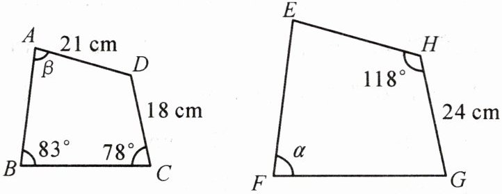 ∴∠B=∠α=83°,∠D=∠H=118°,$\frac{AD}{EH}=\frac{DC}{HG}$,即$\frac{21}{EH}=\frac{18}{24}$.