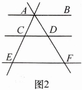 。问题 4:如图 2,AB//CD//EF,直线 AC 与直线 AF 交于点 A,依据问题 3,你又能得到什么结论?