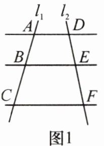 问题 3:如图 1,已知 AD//BE//CF,它们依次交直线 l₁,l₂于点 A,B,C 和点 D,E,F。通过度量线段 AB,BC,DE,EF 的长度,说明$\frac{AB}{BC}$与$\frac{DE}{EF}$相等吗?