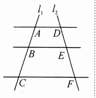 1.【例 1】如图,AD//BE//CF,直线 l₁,l₂与这三条平行线分别相交于点 A,B,C 和点 D,E,F。已知 AB = 1,BC = 3,DE = 2,则 EF 的长为