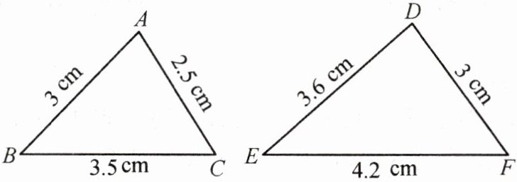 ∵$\frac {AB}{DE}=\frac {3}{3.6}=\frac {5}{6},\frac {BC}{EF}=\frac {3.5}{4.2}=\frac {5}{6},\frac {AC}{DF}=\frac {2.5}{3}$$=\frac {5}{6},\therefore \frac {AB}{DE}=\frac {BC}{EF}=\frac {AC}{DF}.\therefore \triangle ABC\backsim \triangle DEF.$