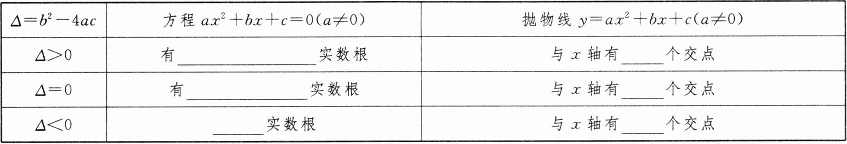 1. 当$b^2 - 4ac > 0$时,方程有两个不相等的实数根;当$b^2 - 4ac = 0$时,方程有两个相等的实数根;当$b^2 - 4ac < 0$时,方程没有实数根。2. 顶点$(\frac{1}{4}, -\frac{9}{8})$,与x轴交点$(1, 0)$、$(-\frac{1}{2}, 0)$,与y轴交点$(0, -1)$。