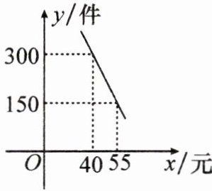 (1) 设 $y = kx + b$,由图可知,当 $x = 40$ 时,$y = 300$;当 $x = 55$ 时,$y = 150$。