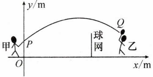 7. 如图,这是甲、乙两人进行羽毛球练习赛时的一个瞬间,羽毛球飞行的高度$y(m)$与水平距离$x(m)$的路线为抛物线的一部分,如图,甲在O点正上方1m的P处发出一球,已知点O与球网的水平距离为5m,球网的高度为1.55m。羽毛球沿水平方向运动4m时,达到羽毛球距离地面最大高度是$\frac{5}{3}m$。
