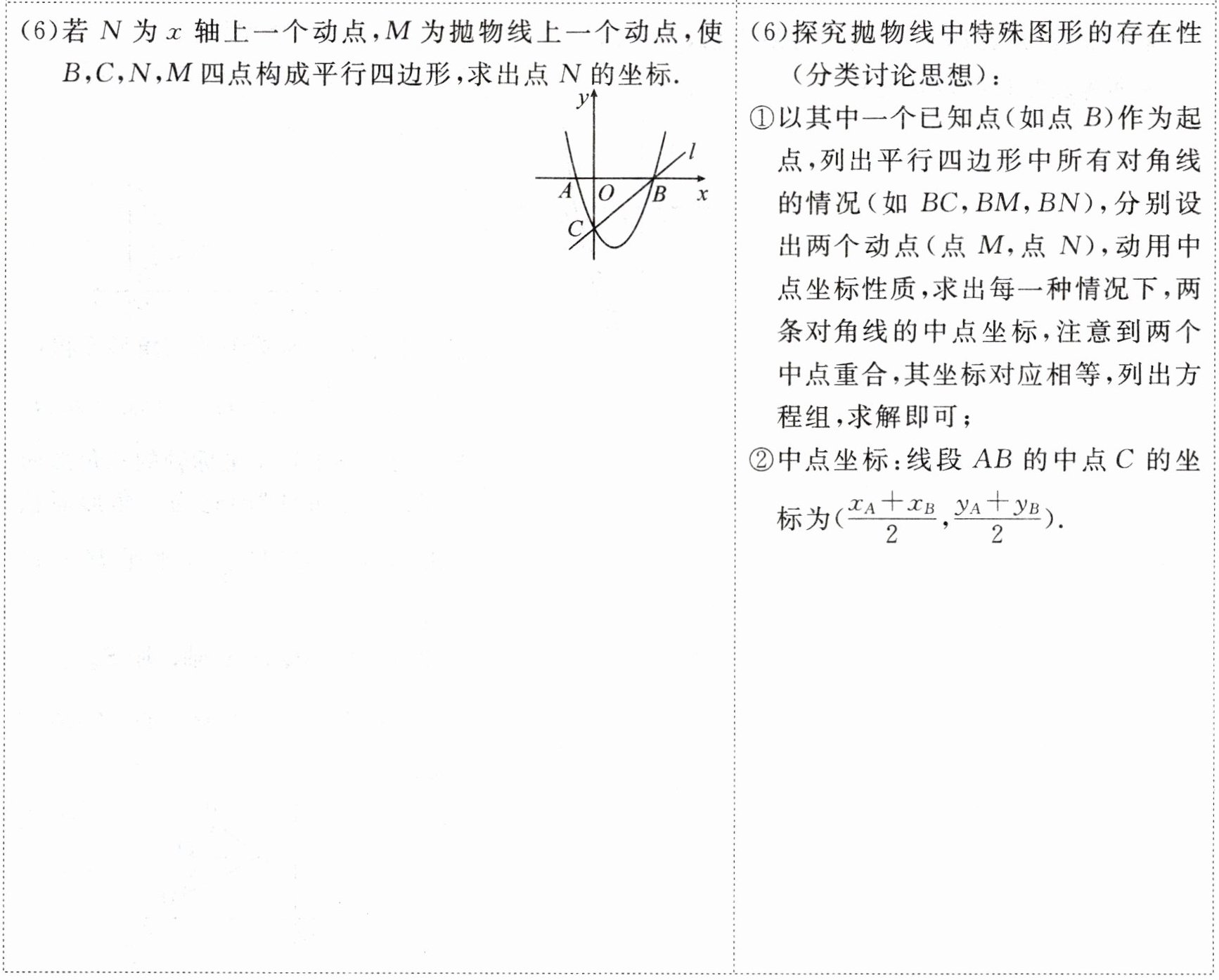 (6)设点M的坐标为(m,m²-2m-3),点N的坐标为(n,0).根据平行四边形对角线的性质及中点坐标性质可得:①当BC为对角线时,{xB+xC=xM+xN,yB+yC=yM+yN,即{3+0=m+n,0-3=m²-2m-3+0,解得m₁=0(舍去),m₂=2.