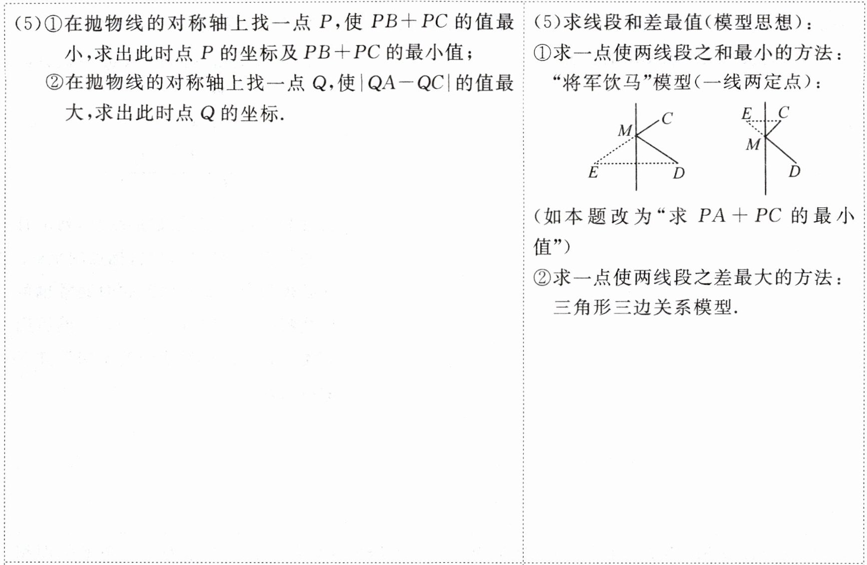 (5)①依题意,得对称轴为直线x=1.连接BC交对称轴于点P,此时PB+PC的值最小.当x=1时,y=1-3=-2,即此时点P的坐标为(1,-2),PB+PC=BC=√(OB²+OC²)=√(3²+3²)=3√2.②连接AC并延长AC交抛物线对称轴于点Q,此时|QA-QC|的值最大,且|QA-QC|的最大值为线段AC的长.依题意,得A(-1,0),C(0,-3),可求得直线AC的解析式为y=-3x-3.当x=1时,y=-3x-3=-3×1-3=-6.