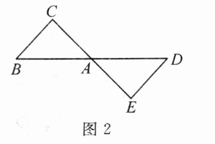 2. 如图2,已知 $AC = AE$,$AB = AD$,将 $\triangle ABC$ 绕点 $A$ 逆时针旋转 $180^{\circ}$,观察旋转后的三角形与 $\triangle ADE$ 的关系.