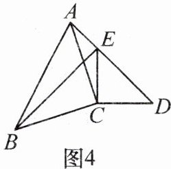(3)如图4,在$\triangle ABC$和$\triangle ECD$中,$BC=AC$,$CE=CD$,$\angle ACB=\angle DCE=90^{\circ}$,将$\triangle ECD$绕点$C$旋转,使得点$A$落在$DE$的延长线上,连接$BE$,此时$\triangle ACD≌\triangle BCE$还成立吗?若$CD=CE=2\sqrt{2}$,$AE=2$,求线段$AB$的长.