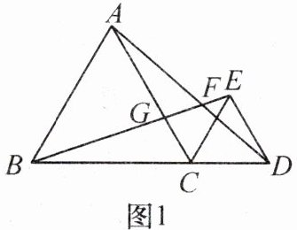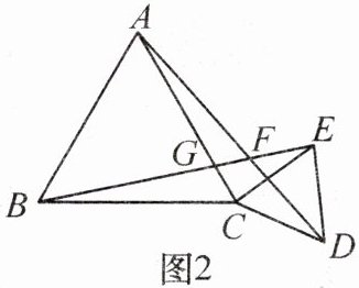 1. (1)如图1,已知$\triangle ABC$和$\triangle ECD$是等边三角形,点$B$,$C$,$D$在同一条直线上,连接$BE$,交边$AC$于点$G$,连接$AD$,交$BE$于点$F$.易证:$\triangle ACD≌\triangle BCE$.若将$\triangle ECD$绕点$C$顺时针旋转一定的角度$\alpha(0^{\circ}<\alpha<60^{\circ})$(如图2),此时$\triangle ACD≌\triangle BCE$还成立吗?请说明理由;