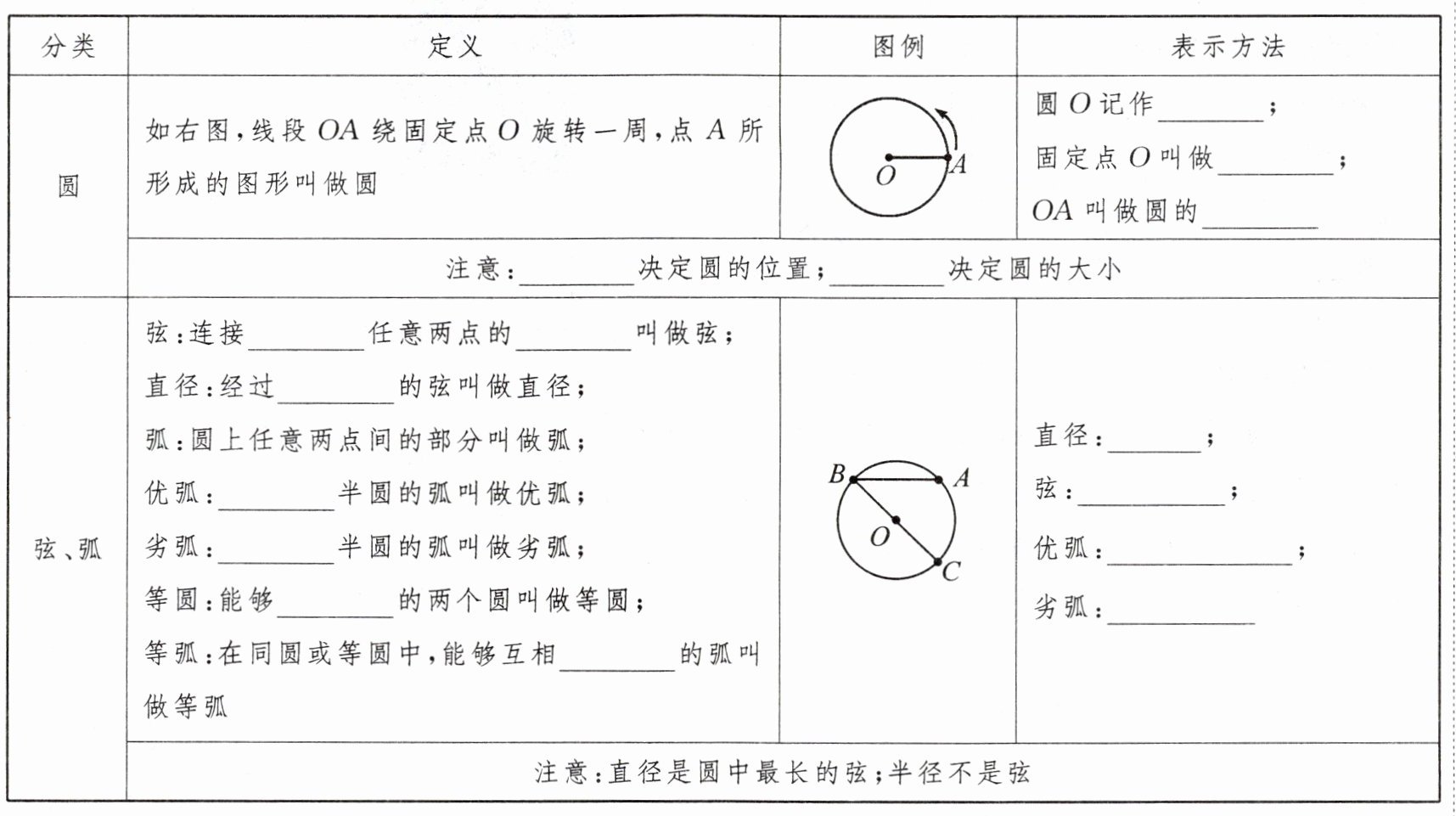 $\odot O$ 圆心 半径 圆心 半径 圆上 线段 圆心 大于 小于 重合 重合 BC AB,BC $\overset{\frown}{ABC}$,$\overset{\frown}{BCA}$ $\overset{\frown}{AB}$,$\overset{\frown}{AC}$