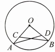 5. 【例 3】如图,已知 $OA$,$OB$ 是 $\odot O$ 的半径,$C$,$D$ 为 $OA$,$OB$ 上的两点,且 $AC = BD$。求证:$AD = BC$。