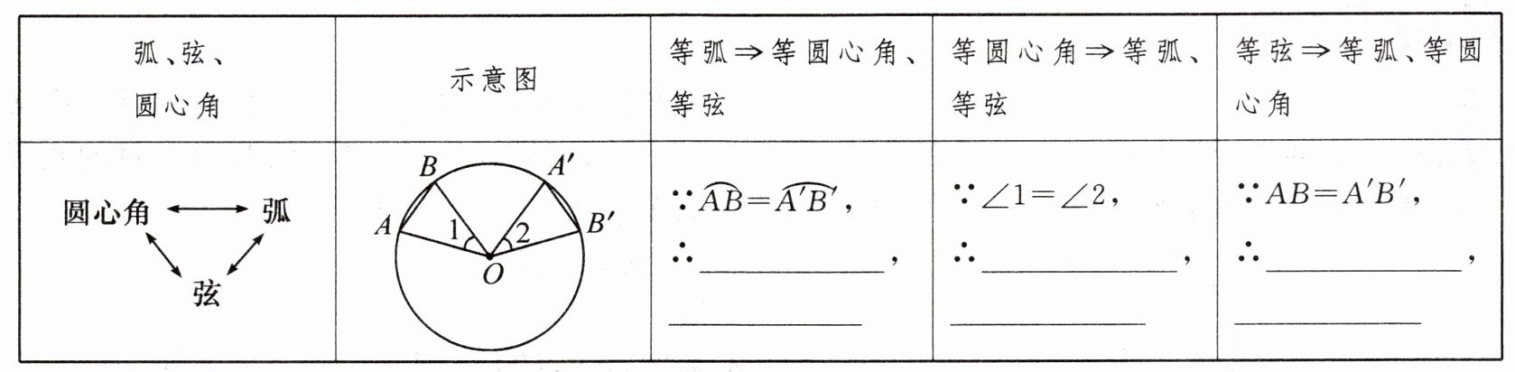 问题1:圆心 圆心角 归纳:同圆或等圆 两个圆心角、两条弧、两条弦 ∠1=∠2 AB=A'B' $\widehat{AB}=\widehat{A'B'}$ AB=A'B' $\widehat{AB}=\widehat{A'B'}$ ∠1=∠2