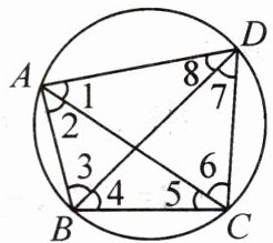 4. (教材九上P88练习T2)如图,圆内接四边形$ABCD$的对角线$AC$,$BD$把它的4个内角分成8个角,这些角中哪些相等?为什么?