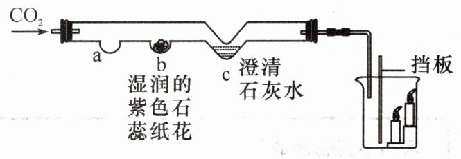 (1)紫色纸花变红 干燥的紫色石蕊纸花 (2)CO₂+Ca(OH)₂=H₂O+CaCO₃↓ (3)下面的蜡烛先灭,上面的蜡烛后灭 密度比空气大