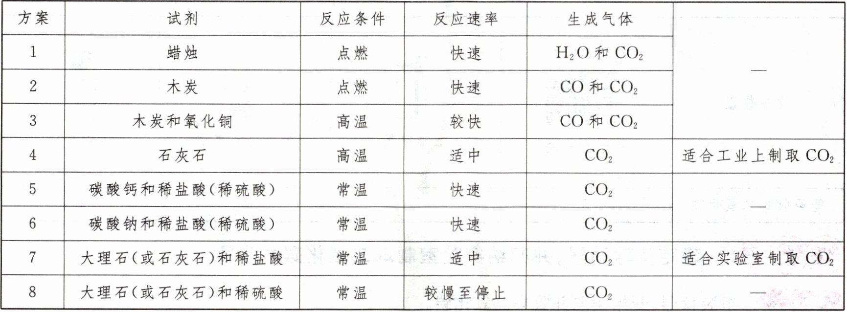 活动 1 分析工业上和实验室制取 $ {CO_{2}} $ 所选试剂和反应条件、反应速率的差别,归纳总结工业上和实验室制取 $ {CO_{2}} $ 的反应原理及考虑因素。