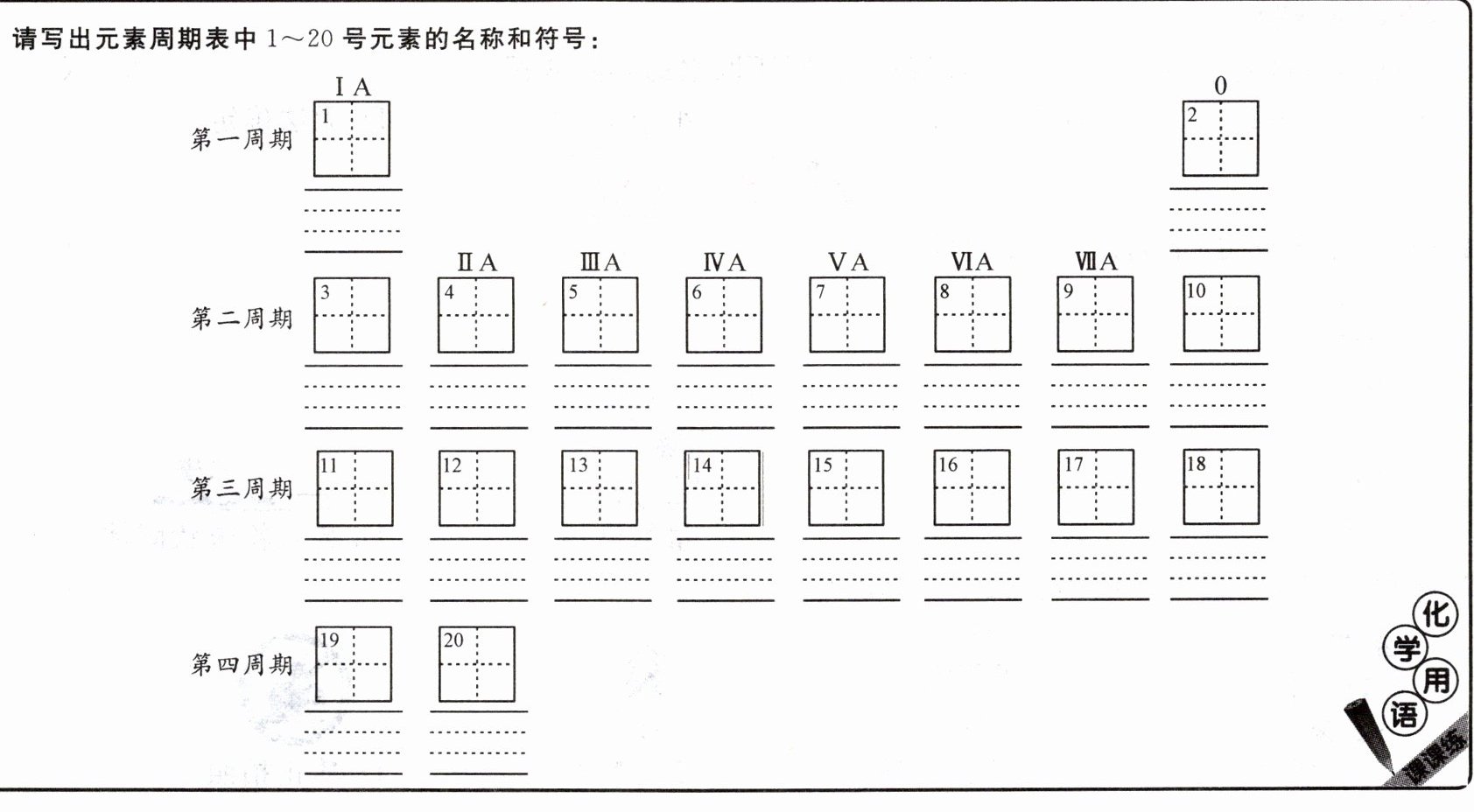 1号:氢($H$);2号:氦($He$);3号:锂($Li$);4号:铍($Be$);5号:硼($B$);6号:碳($C$);7号:氮($N$);8号:氧($O$);9号:氟($F$);10号:氖($Ne$);11号:钠($Na$);12号:镁($Mg$);13号:铝($Al$);14号:硅($Si$);15号:磷($P$);16号:硫($S$);17号:氯($Cl$);18号:氩($Ar$);19号:钾($K$);20号:钙($Ca$)。