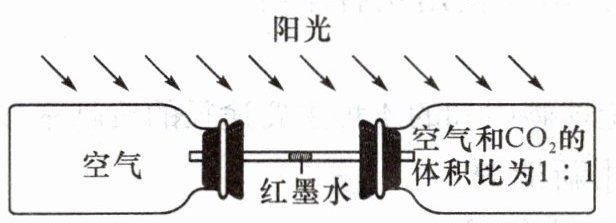 【设计并进行实验】某化学兴趣小组设计实验验证二氧化碳的温室效应。如上图所示,他们选用体积大小相等的两个塑料瓶,分别盛满相同条件下的空气、空气和CO₂的混合物(体积比1:1),并用一个小塑料管连接(在塑料管中间有一滴红墨水),置于阳光下。一段时间后观察。
