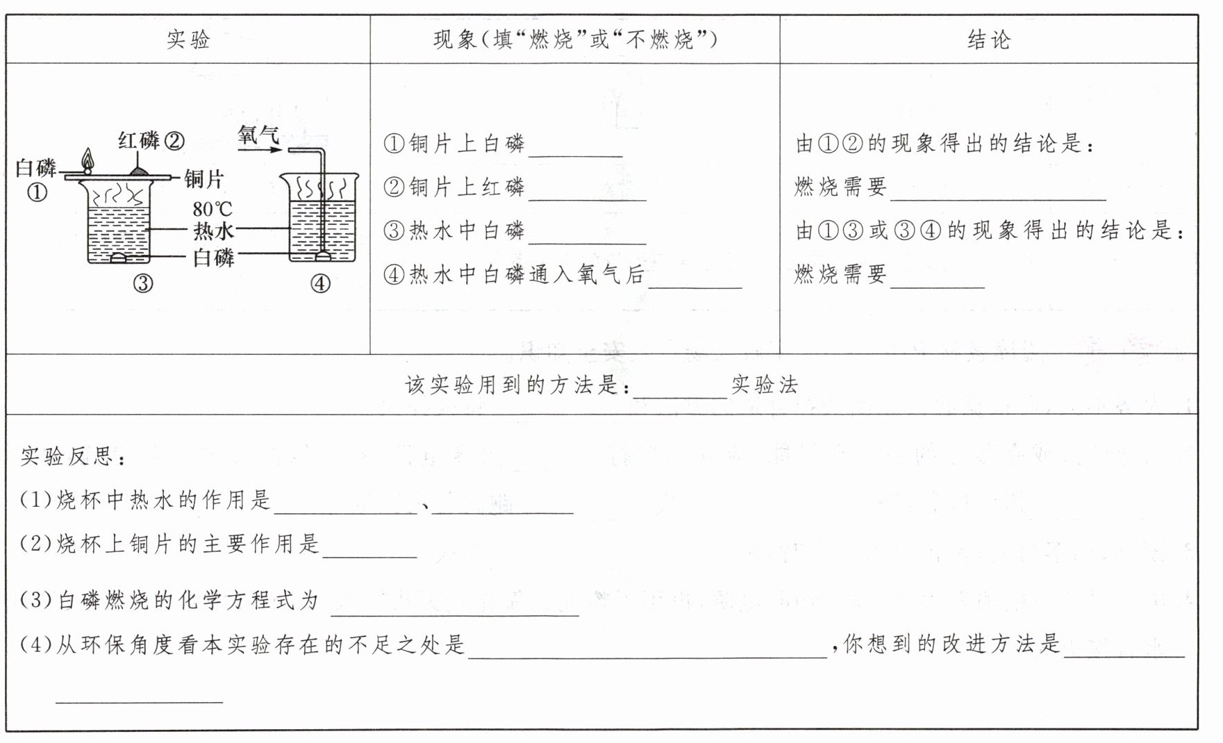 温度未达到着火点;放出;可燃物;氧气;温度达到着火点;固定不变;燃烧;不燃烧;不燃烧;燃烧;温度达到着火点;氧气;对比;提供热量;隔绝氧气;导热;$4\mathrm{P}+5{\mathrm{O}}_{2}\xlongequal{点燃}2{\mathrm{P}}_{2}{\mathrm{O}}_{5}$;产生的五氧化二磷会污染空气;在密闭容器中进行实验