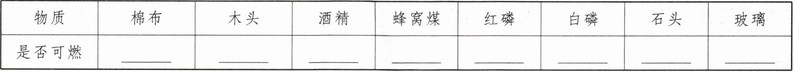 活动1 结合你的生活经验,请在可以燃烧的物质(可燃物)下面画√,非可燃物下面画×。