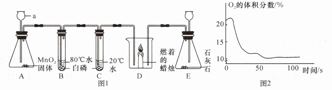 (5)图2是利用传感器测得密闭集气瓶内过量红磷燃烧至熄灭过程中O₂的体积分数随时间变化的曲线。分析曲线,你对燃烧的条件有何新的认识?