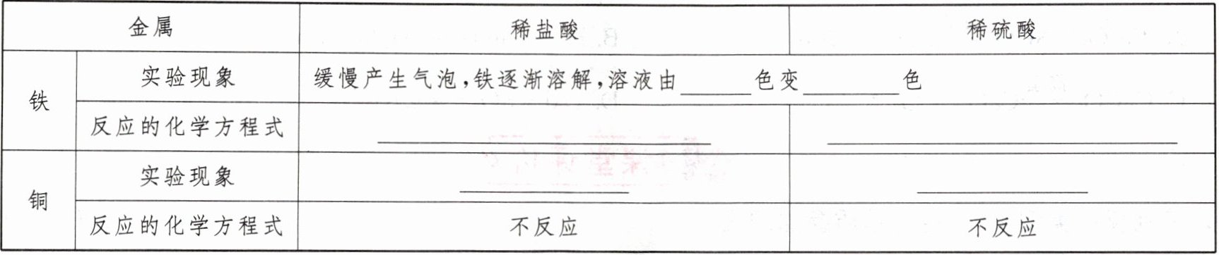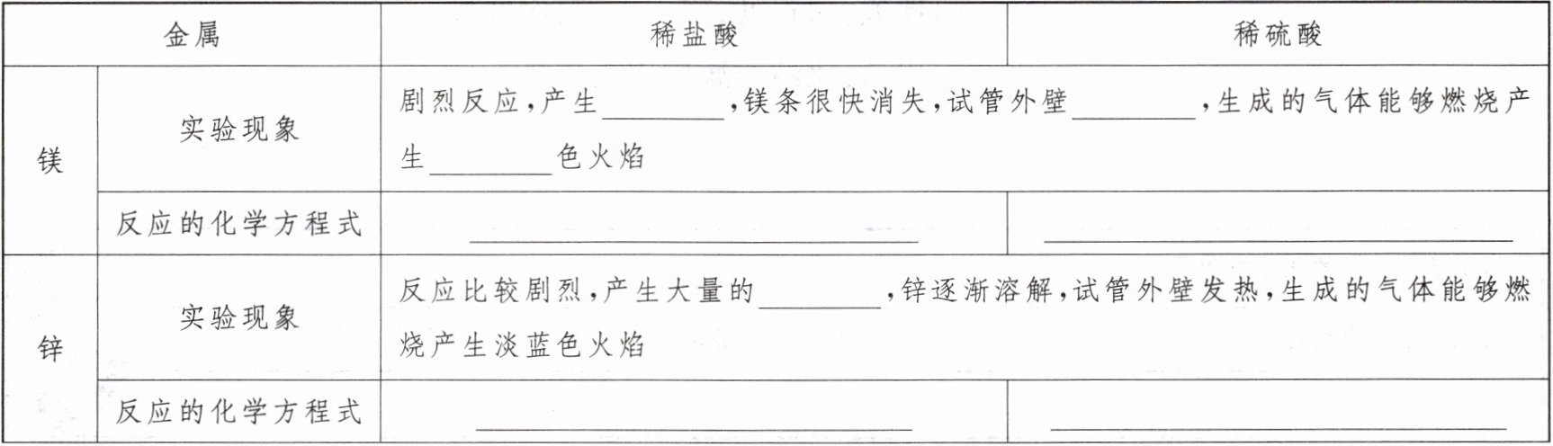 活动2 气泡 发烫 淡蓝 $\mathrm{M}\mathrm{g}+2\mathrm{H}\mathrm{C}\mathrm{l}\xlongequal{\;\;}\mathrm{M}\mathrm{g}\mathrm{C}{\mathrm{l}}_{2}+{\mathrm{H}}_{2}\uparrow$ $\mathrm{M}\mathrm{g}+{\mathrm{H}}_{2}\mathrm{S}{\mathrm{O}}_{4}\xlongequal{\;\;}\mathrm{M}\mathrm{g}\mathrm{S}{\mathrm{O}}_{4}+{\mathrm{H}}_{2}\uparrow$ 气泡 $\mathrm{Z}\mathrm{n}+2\mathrm{H}\mathrm{C}\mathrm{l}\xlongequal{\;\;}\mathrm{Z}\mathrm{n}\mathrm{C}{\mathrm{l}}_{2}+{\mathrm{H}}_{2}\uparrow$ $\mathrm{Z}\mathrm{n}+{\mathrm{H}}_{2}\mathrm{S}{\mathrm{O}}_{4}\xlongequal{\;\;}\mathrm{Z}\mathrm{n}\mathrm{S}{\mathrm{O}}_{4}+{\mathrm{H}}_{2}\uparrow$ 无 浅绿 $\mathrm{F}\mathrm{e}+2\mathrm{H}\mathrm{C}\mathrm{l}\xlongequal{\;\;}\mathrm{F}\mathrm{e}\mathrm{C}{\mathrm{l}}_{2}+{\mathrm{H}}_{2}\uparrow$ $\mathrm{F}\mathrm{e}+{\mathrm{H}}_{2}\mathrm{S}{\mathrm{O}}_{4}\xlongequal{\;\;}\mathrm{F}\mathrm{e}\mathrm{S}{\mathrm{O}}_{4}+{\mathrm{H}}_{2}\uparrow$ 无明显现象 无明显现象 总结:1.镁、锌、铁 氢气 铜 2.强