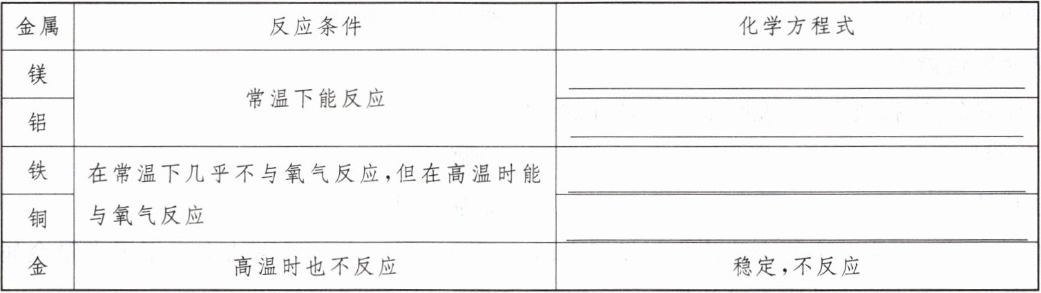 活动1 阅读教材P10,比较镁、铝、铁、铜、金与氧气的难易与剧烈程度(具体实验现象回顾第二单元 课题二《氧气》)。