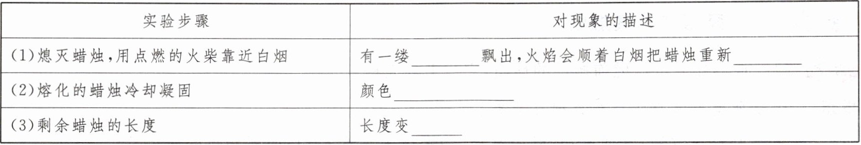 思考:熄灭蜡烛,观察并描述蜡烛熄灭时的现象。用燃着的火柴去点蜡烛刚熄灭时产生的白烟,观察蜡烛是否能够重新燃烧?蜡烛熄灭后,其颜色、长度等与点燃前相比有什么变化?