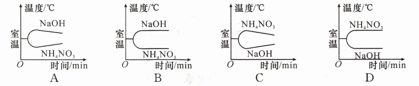 3. 将相同质量的NaOH固体和NH₄NO₃固体,分别同时放入装有100mL水的烧杯中,用仪器测量溶液温度随时间变化情况。则下列“温度—时间”曲线正确的是(