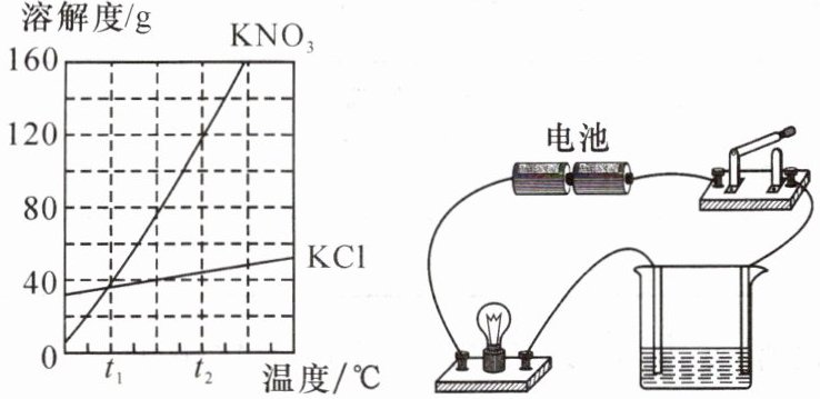 3. (2024·深圳福田区二模)溶液的导电性主要取决于单位体积内的离子个数。其他条件相同时,单位体积内离子个数越多导电性越强。已知KCl溶于水能完全解离出K⁺和Cl⁻,KNO₃和KCl的溶解度曲线和导电性实验如图所示。以下分析正确的是(
