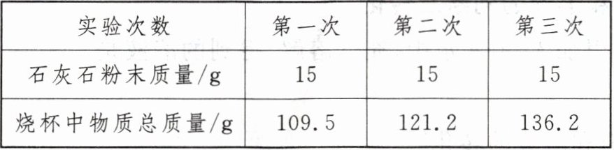 2. (2024·梅州模拟)小明用石灰石测定某稀盐酸中溶质的质量分数,向盛有$100 g$稀盐酸的烧杯中依次加入石灰石粉末(杂质不参加反应),充分反应后,记录实验数据见下表。请计算: