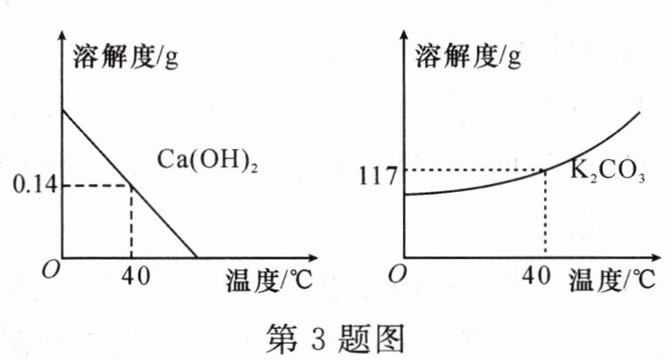 D.40 °C 时, $ Ca(OH)_{2} $ 的溶解度比 $ K_{2}CO_{3} $ 的溶解度大