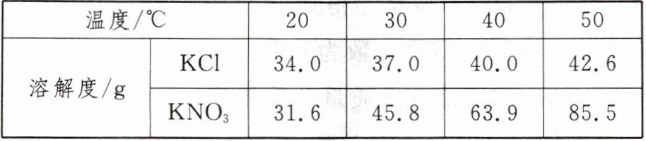 下表是 KCl 和 $ KNO_{3} $ 在不同温度下的溶解度,判断两物质溶解度相等时的温度范围: