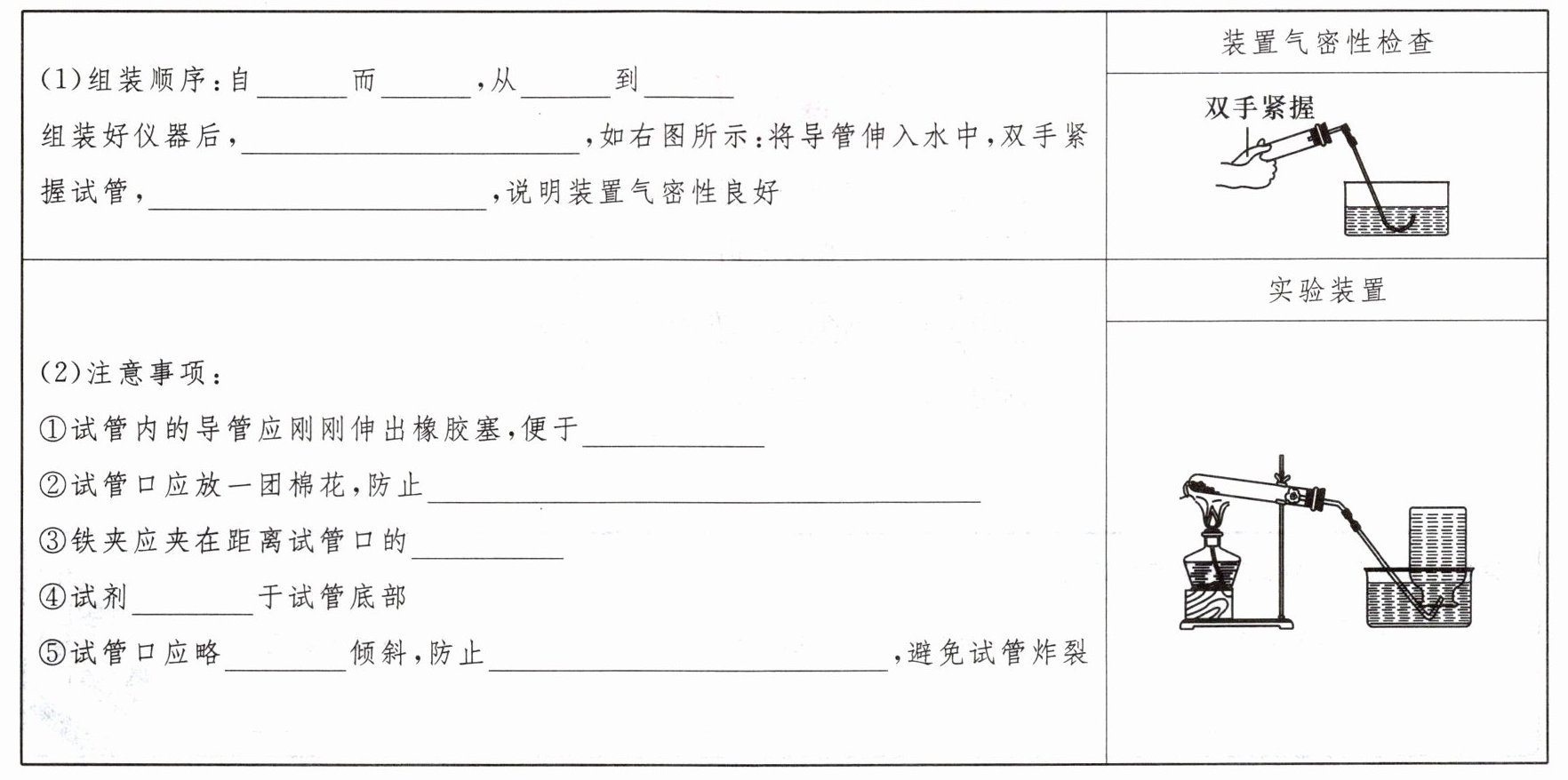 (2)①气体导出 ②加热时试管内的粉末状物质进入导管 ③中上部 ④平铺 ⑤向下 冷凝水流至热的试管底部 5.来回移动 6.连续并均匀地 空气 排尽集气瓶中的空气,使收集气体更纯 口 7.倒吸入试管,使试管因骤然冷却炸裂