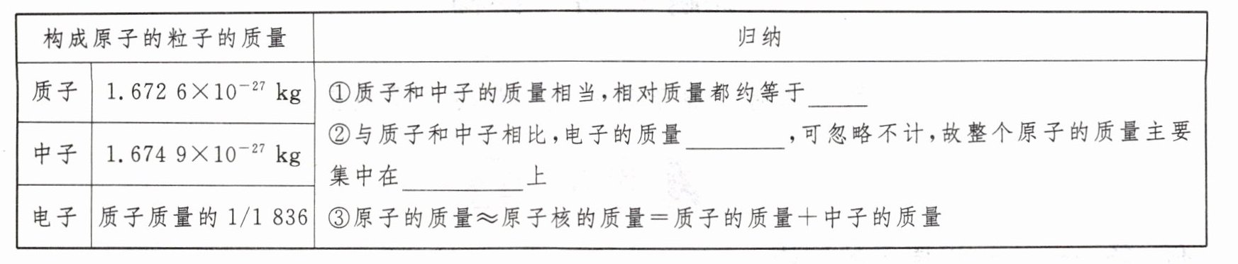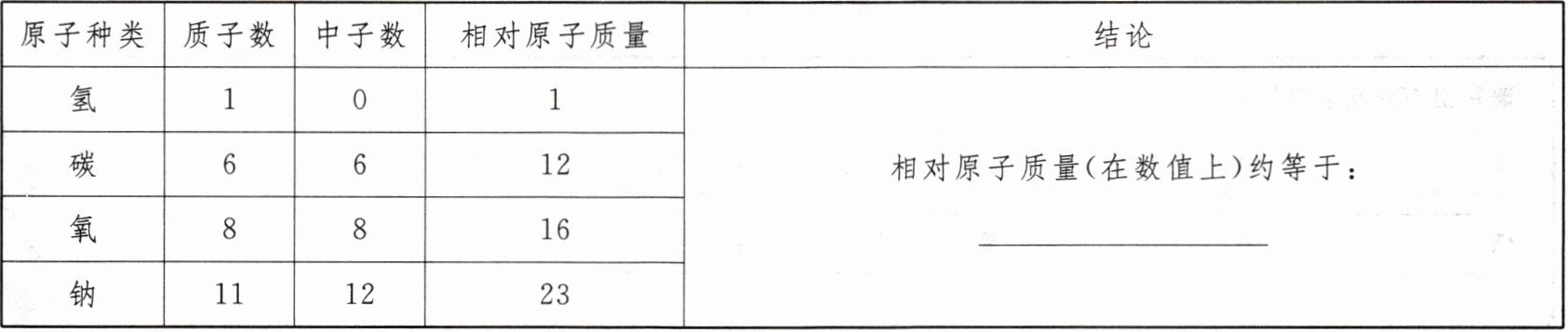 5. 仔细观察表格中的数据并讨论,找出相对原子质量与质子数、中子数之间的联系。
