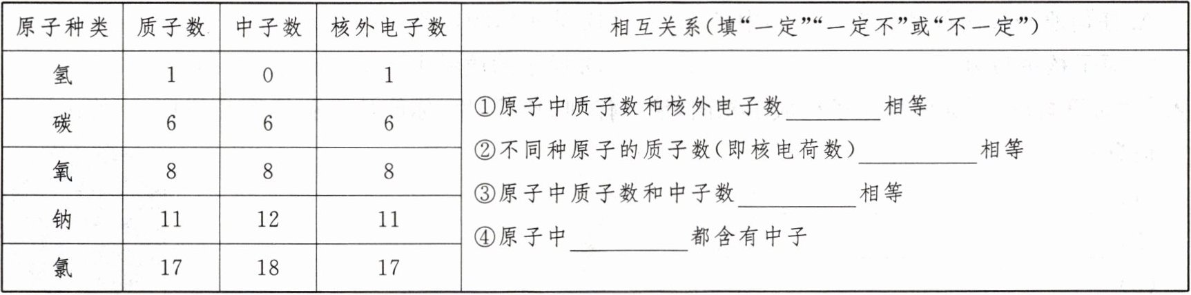 1.正 中子 一 负 2.数量 电性 3.质子数 核外电子数 讨论:一定 一定不 不一定 不一定
